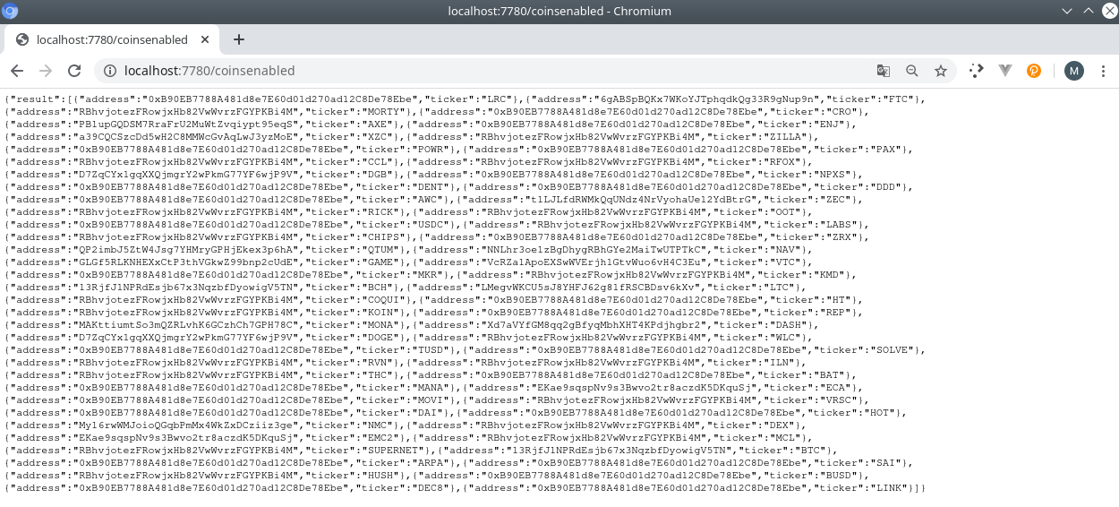 The middleware is a web server that sits between the atomicDEX API RPC interface, and your browser. Browse to http://localhost:7780/coinsenabled and you will get a JSON response like the image showing 64 wallet addresses for different coins supported out-of-the-box.