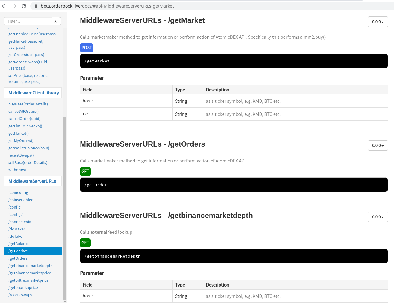 Other URL endpoints require POST method, which is done through a web form or with a developer tool like insomnia or postman. Documentation for the other endpoints is waiting to be published after atomicDEX is released, here is a preview at the beta orderbook site.