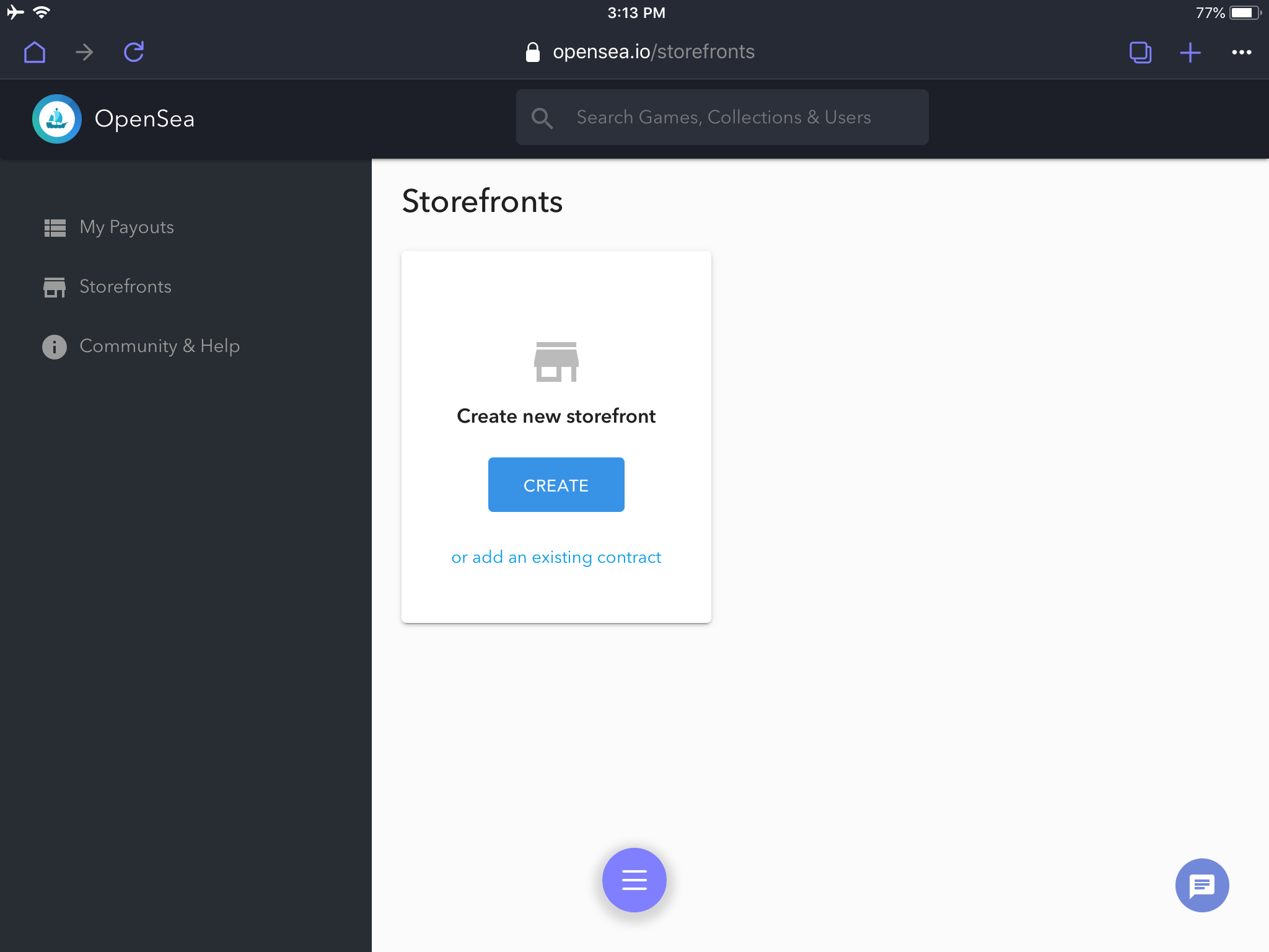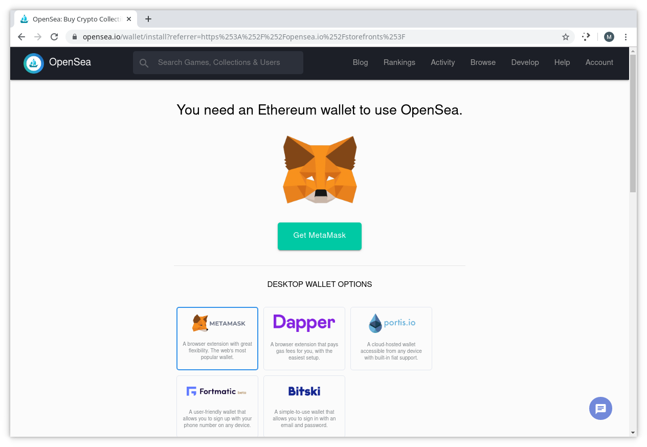 The OpenSea project provides a very easy way to navigate the creation of a storefront on OpenSea. Simply visit the OpenSea Storefront Manager and you are greeted with this in the browser.