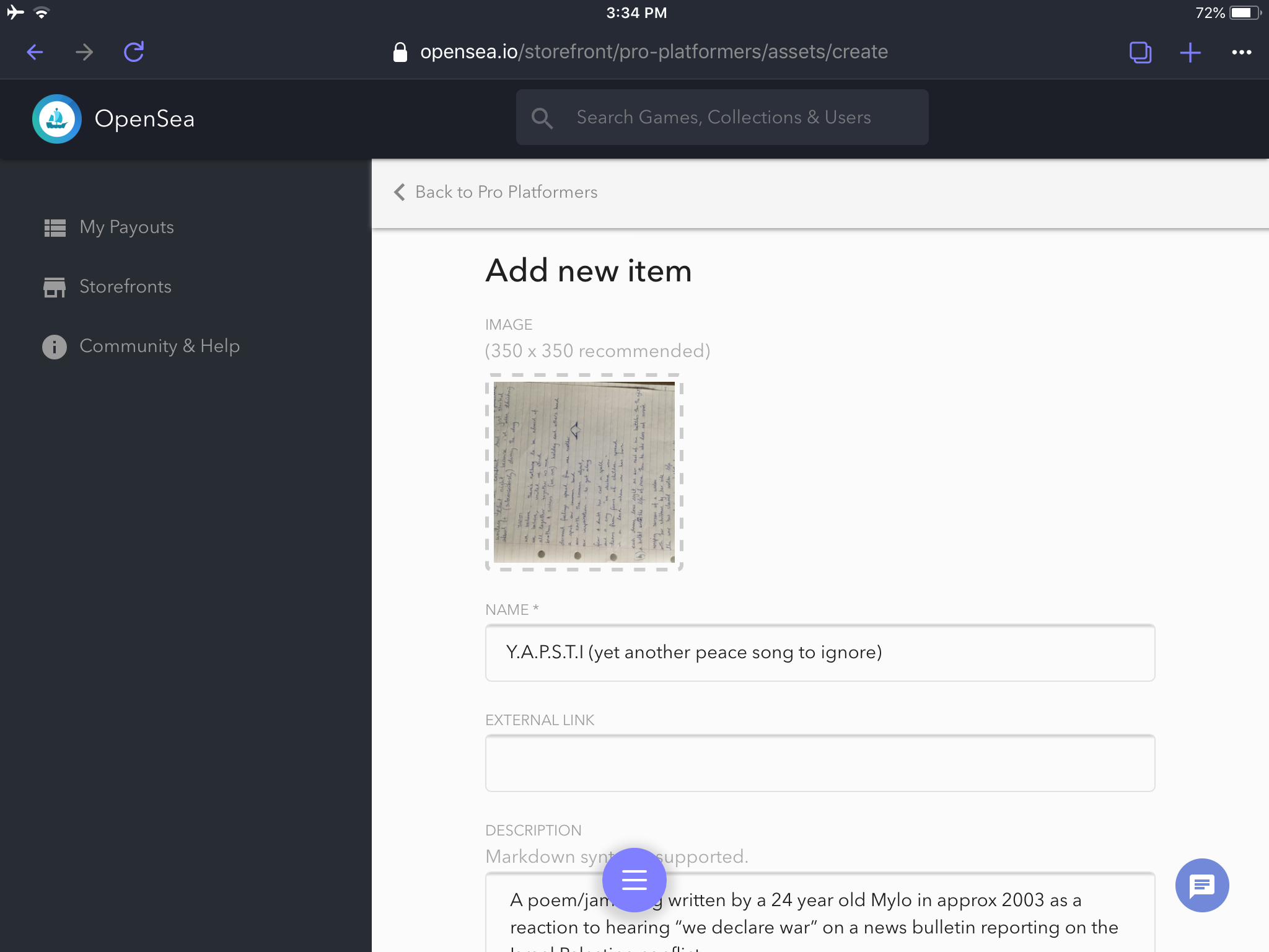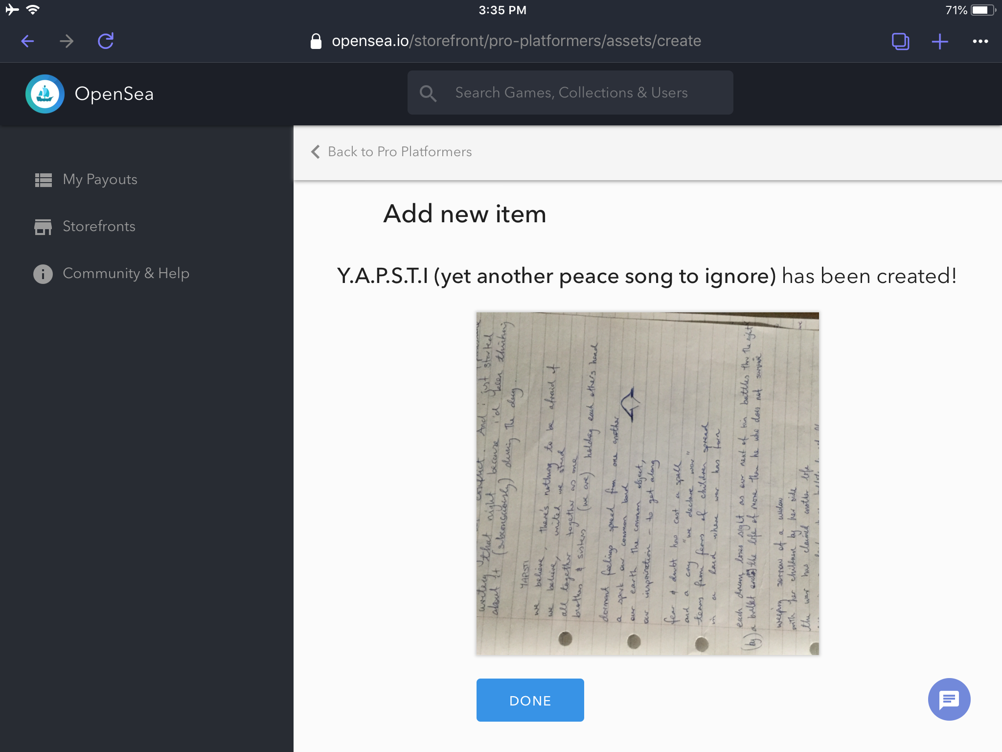 For this item, I'm uploading a copy of some song lyrics with the purchaser receiving the right to be acknowledged in my next song about "Navigating The OpenSea" - a tongue-in-cheek play on words about sailing the world of digital items!