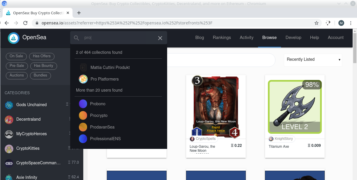 This guide does not go into embedding the storefront in your own application yet, but as you can see from this picture - the Pro Platformers storefront can be found in the OpenSea search box with relative ease alongside legends in the asset tokenization market like CryptoKitties, Gods Unchained & Decentraland.