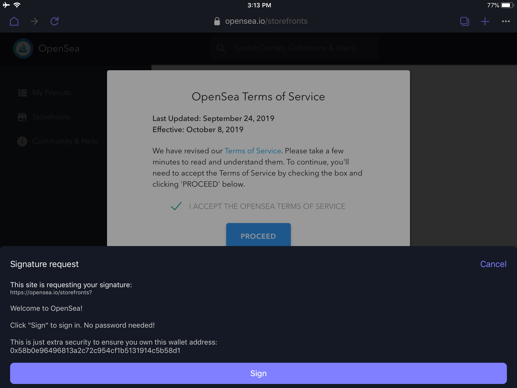 Click Create on the create a new storefront card & digitally sign the no-fee transaction to accept the OpenSea terms of service.