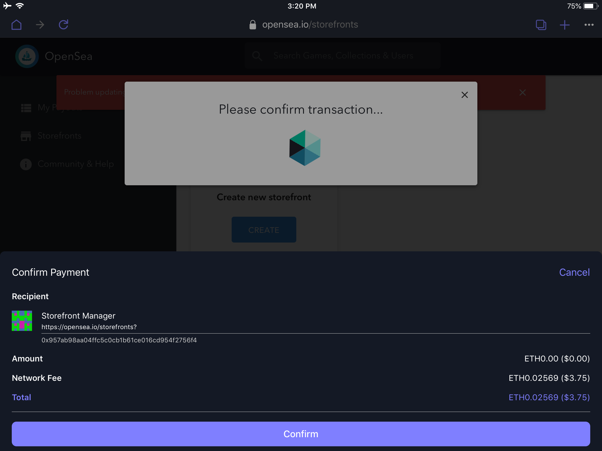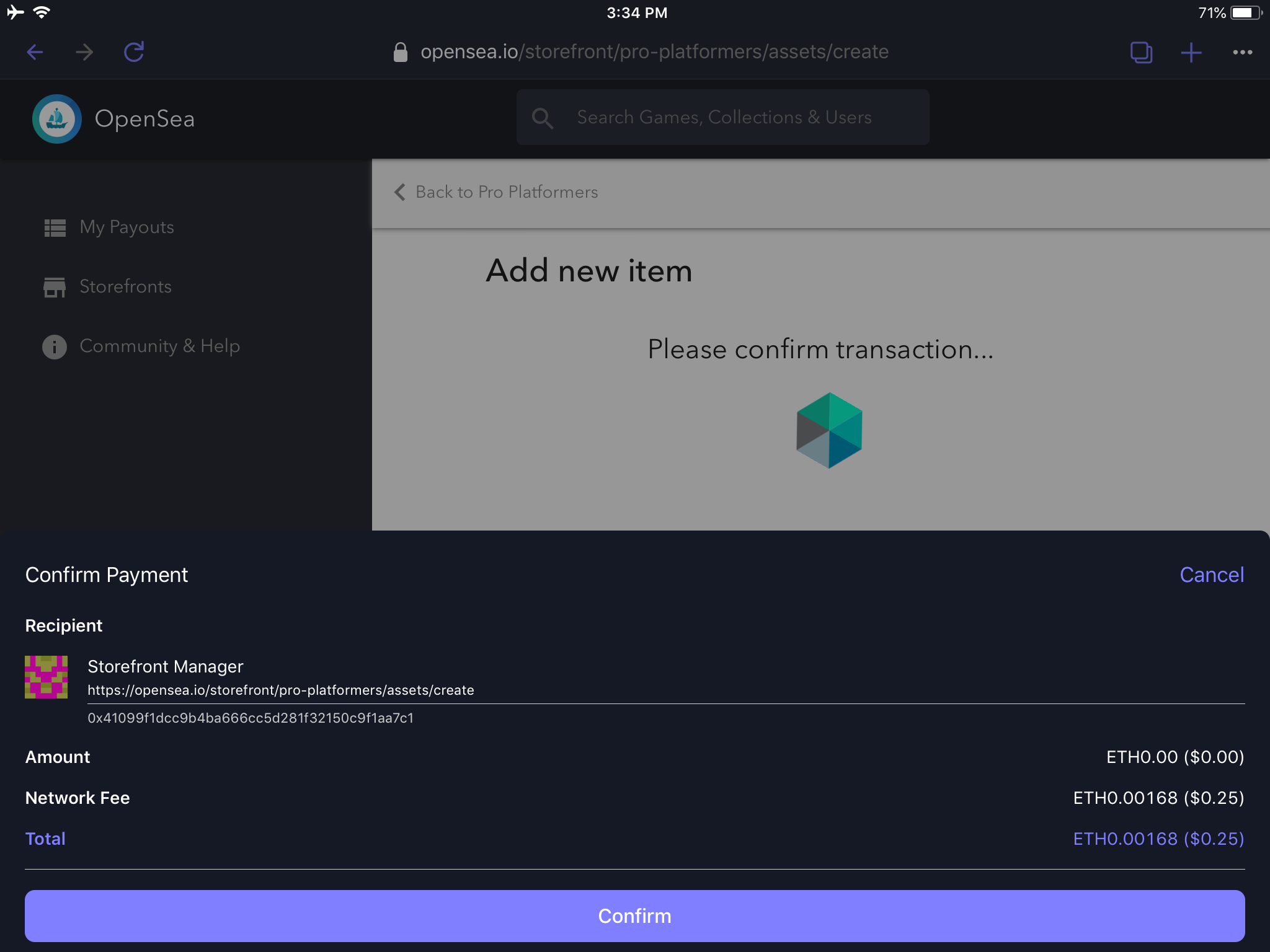 After filling in the item details, the storefront manager requires payment authentication to create this item (e.g a unique NFT digital item) to the storefront (the token contract).