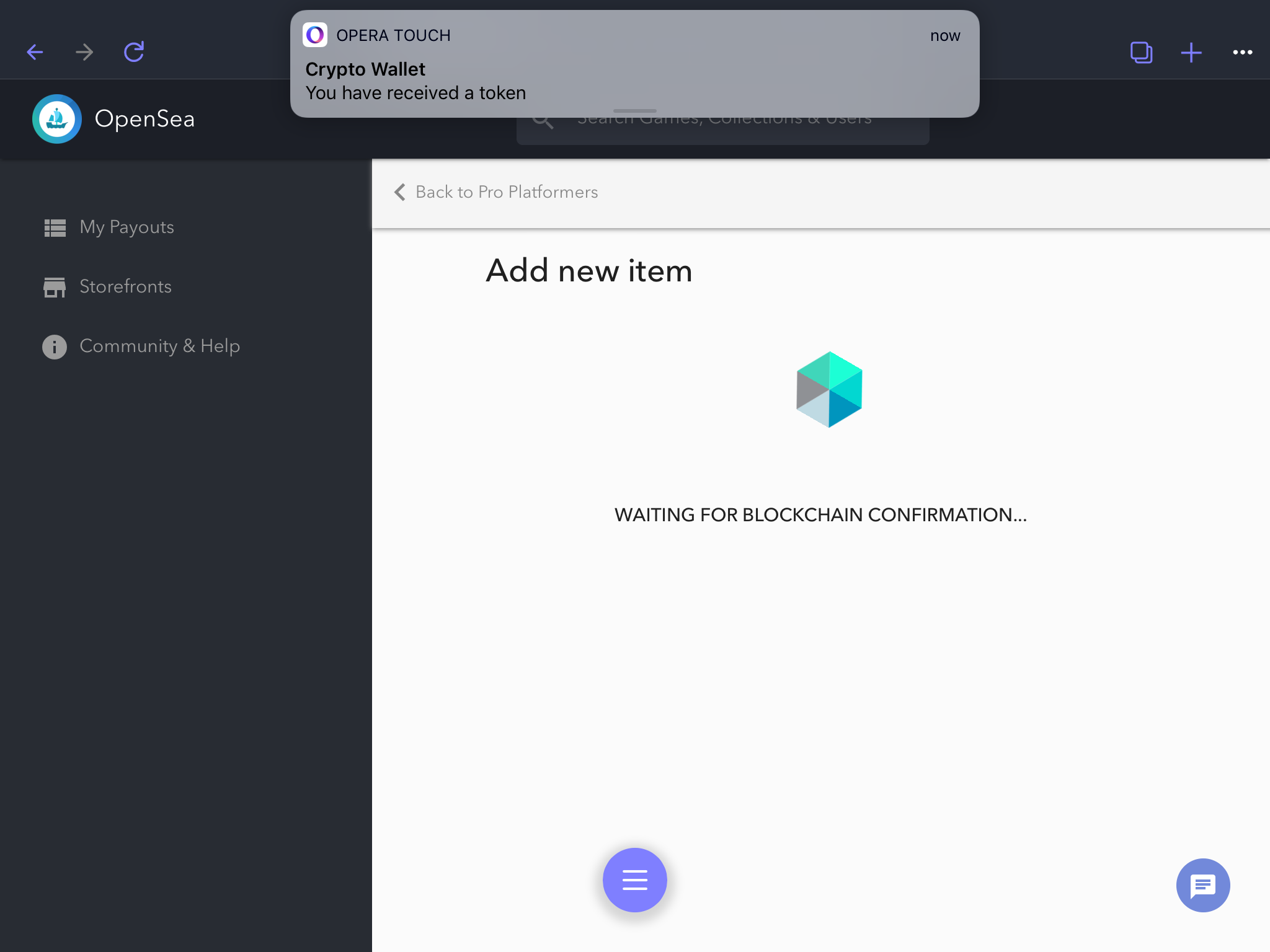After confirming the payment, the transaction needs to be confirmed by the network. This will take about 10-20 seconds and a notification should be received by your wallet integration. The following screenshot shows the Opera Wallet giving me a notification of a token created.